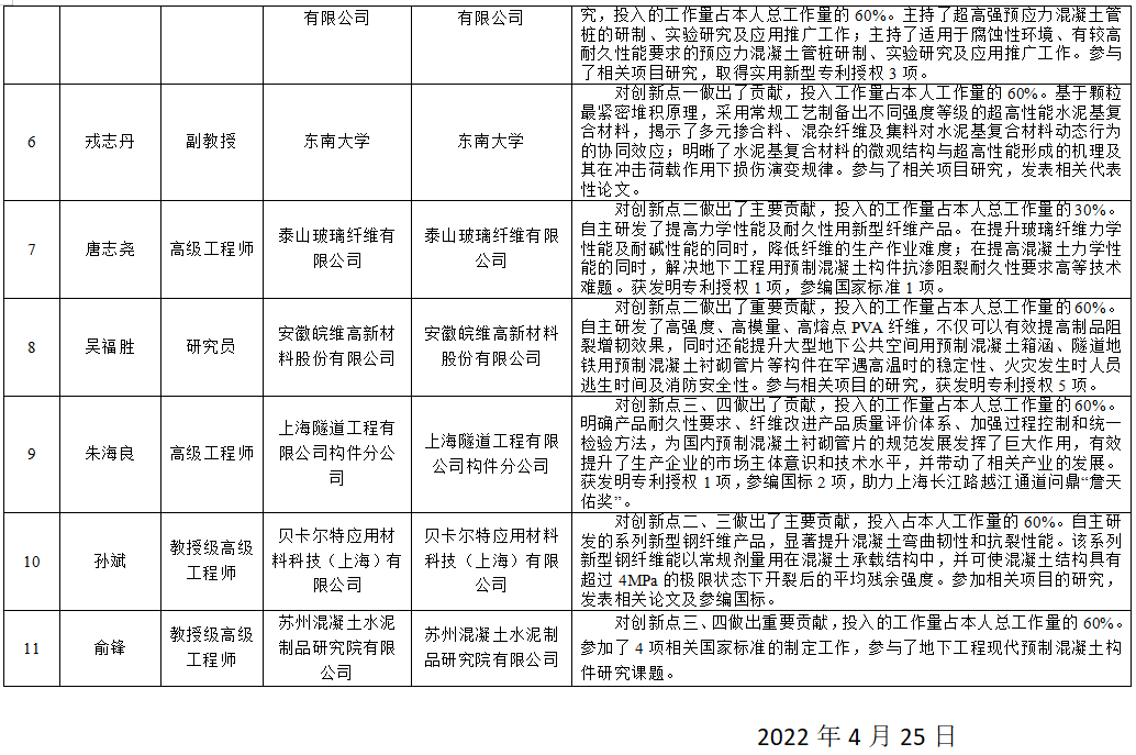 主要完成單位: 東南大學(xué),揚(yáng)州大學(xué),蘇州混凝土水泥制品研究院有限公司,蘇州混凝土水泥制品研究院檢測(cè)中心有限公司,建華建材(中國(guó))有限公司,安徽皖維高新材料股份有限公司,泰山玻璃纖維有限公司,上海隧道工程有限公司構(gòu)件分公司,貝卡爾特應(yīng)用材料科技(上海)有限公司