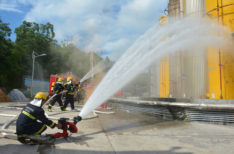 根據應急預案響應,參演人員全力以赴,積極應對險情;公司消防隊迅速出動,專職消防人員從架設水槍開展專業撲救,到身穿防化服進入泄漏點進行檢測和堵漏;環保人員對事故現場周圍大氣環境和事故污水進行了收集和有效監測,充分展示了有機分廠、保衛處消防隊、生產安環部等相關單位的應急處置能力,達到了練指揮、練技能、練協同、練戰法、練保障的效果。