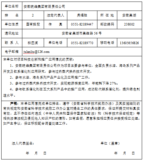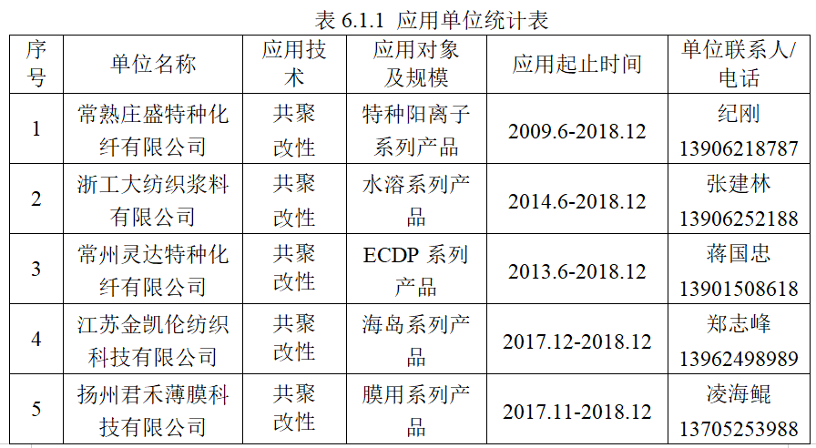 2019年4月24日,安徽省科學(xué)技術(shù)情報(bào)研究所對(duì)皖維公司“基于有機(jī)無(wú)機(jī)雜化鈦系催化劑的高級(jí)特種陽(yáng)離子聚酯樹(shù)脂的產(chǎn)業(yè)化”項(xiàng)目科研成果開(kāi)展技術(shù)查新,其查新結(jié)論是:本課題所研究的鈦系催化劑開(kāi)發(fā)及應(yīng)用于特種陽(yáng)離子聚酯的產(chǎn)業(yè)化研究,采用東華大學(xué)研發(fā)的尺度片狀鈦系聚酯催化劑在酯化釜在線添加,采用管道在線添加高含量(12%,常規(guī)2.5%)改性單體間苯二甲酸-5-磺酸鈉,并與動(dòng)、靜態(tài)混合器相結(jié)合的方法,這在檢測(cè)報(bào)告中的相關(guān)文獻(xiàn)中未見(jiàn)其他單位有相同內(nèi)容的報(bào)道(附件2.2.1)。