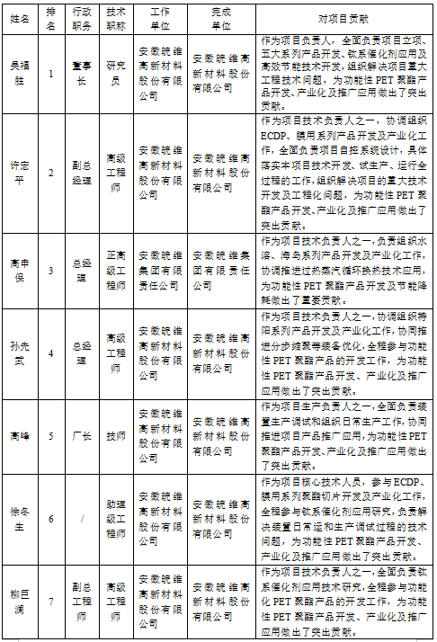 1、項(xiàng)目第完成人吳福勝與第二完成人許宏平、第三完成人高申保、第四完成人孫先武、第五完成人高峰、第七完成人柳巨瀾、第八完成人錢(qián)光海、第十完成人歐陽(yáng)勇軍共同實(shí)施“多元改性功能化聚對(duì)苯二甲酸乙二醇酯研發(fā)及產(chǎn)業(yè)化”項(xiàng)目實(shí)施,合作方式為共同立項(xiàng)。