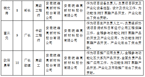 2020年6月5日,安徽工業(yè)經(jīng)濟(jì)聯(lián)合會(huì)科技成果評(píng)價(jià)中心組織專(zhuān)家對(duì) “WW-4005熱收縮膜用聚酯切片”進(jìn)行鑒定。鑒定意見(jiàn):設(shè)計(jì)間苯二甲酸和新戊二醇組合式改性單體,采用復(fù)配性助劑,通過(guò)分步打漿、酯化等工藝,生產(chǎn)出熱收縮膜用聚酯切片。產(chǎn)品色澤異、熔程短、熱收縮率穩(wěn)定、致性好,在配方設(shè)計(jì)方面具有創(chuàng)新性,相關(guān)技術(shù)已獲授權(quán)發(fā)明專(zhuān)利1項(xiàng),技術(shù)水平國(guó)內(nèi)先。(附件2.2.8)。