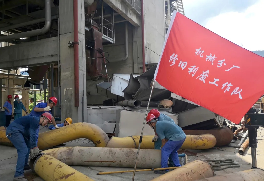 8月3日上午,機械分廠修舊利廢工作隊正式成立,工作隊十幾名成員前往醋酐現場整理、分割維修可再利用材料,拉開了修舊利廢工作的序幕。