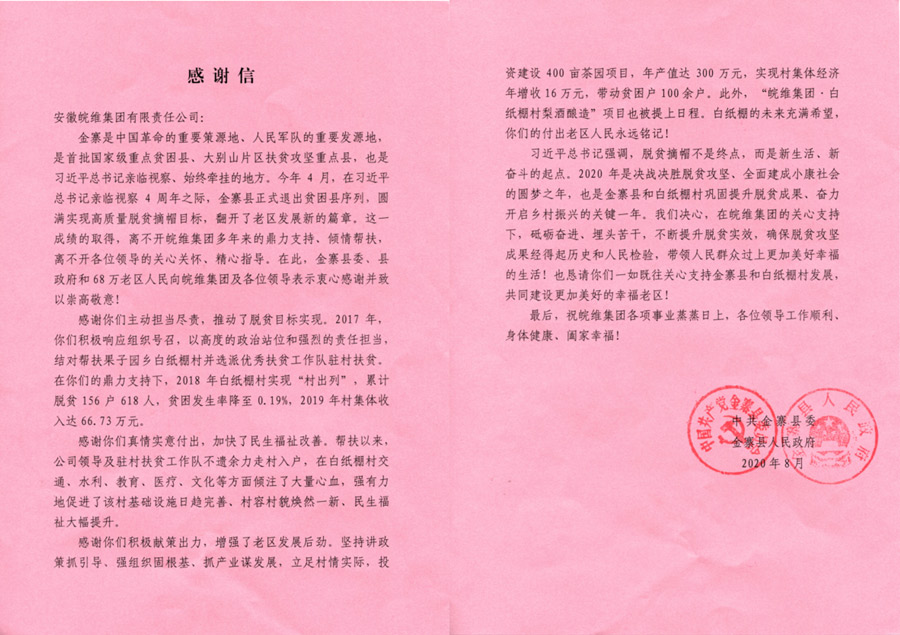 金寨是中國(guó)革命的重要策源地、人民軍隊(duì)的重要發(fā)源地,是批級(jí)重點(diǎn)貧困縣、大別山片區(qū)扶貧攻堅(jiān)重點(diǎn)縣,也是習(xí)近平總書記親臨視察、始終牽掛的地方。今年4月,在習(xí)近平總書記親臨視察4周年之際,金寨縣正式退出貧困縣序列,圓滿實(shí)現(xiàn)高質(zhì)量脫貧摘帽目標(biāo),翻開了老區(qū)發(fā)展新的篇章。這成績(jī)的取得,離不開皖維集團(tuán)多年來的鼎力支持、傾情幫扶,離不開各位導(dǎo)的關(guān)心關(guān)懷、精心指導(dǎo)。在此,金寨縣委、縣中國(guó)和68萬老區(qū)人民向皖維集團(tuán)及各位導(dǎo)表示衷心感謝并致以崇高敬意! 感謝你們主動(dòng)擔(dān)當(dāng)盡責(zé),推動(dòng)了脫貧目標(biāo)實(shí)現(xiàn)。2017年,你們積響應(yīng)組織號(hào)召,以髙度的政治站位和強(qiáng)烈的責(zé)任擔(dān)當(dāng),結(jié)對(duì)幫扶果子園鄉(xiāng)白紙棚村并選派秀扶貧工作隊(duì)駐村扶貧。在你們的鼎力支持下,2018年白紙棚村實(shí)現(xiàn)“村出列”,累計(jì)脫貧156戶618人,貧困發(fā)生率降至0.19%,2019年村集體收入達(dá)66.73萬元。感謝你們真情實(shí)意付出,加快了民生福祉改善。幫扶以來,公司導(dǎo)及駐村扶貧工作隊(duì)不遺余力走村入戶,在白紙棚村交通、水利、教育、醫(yī)療、文化等方面傾注了大量心血,強(qiáng)有力地有利于了該村基礎(chǔ)設(shè)施日趨完善、村容村貌煥然新、民生福祉大幅提升。 感謝你們積獻(xiàn)策出力,增強(qiáng)了老區(qū)發(fā)展后勁。堅(jiān)持講政策抓引導(dǎo)、強(qiáng)組織固根基、抓產(chǎn)業(yè)謀發(fā)展,立足村情實(shí)際,投資建設(shè)400畝茶園項(xiàng)目,年產(chǎn)值達(dá)300萬元,實(shí)現(xiàn)村集體經(jīng)濟(jì)年增收16萬元,帶動(dòng)貧困戶100余戶。此外,“皖維集團(tuán)?白紙棚村梨酒釀造”項(xiàng)目也被提上日程。白紙棚的未來充滿希望,你們的付出老區(qū)人民長(zhǎng)久銘記! 習(xí)近平總書記強(qiáng)調(diào),脫貧摘帽不是終點(diǎn),而是新生活新奮斗的起點(diǎn)。2020年是決戰(zhàn)決勝脫貧攻堅(jiān)、完全建成小康社會(huì)的圓夢(mèng)之年,也是金寨縣和白紙棚村鞏固提升脫貧成果、奮力開啟鄉(xiāng)村振興的關(guān)鍵年。我們決心,在皖維集團(tuán)的關(guān)心支持下,砥礪奮進(jìn)、埋頭苦干,不斷提升脫貧實(shí)效,確保脫貧攻堅(jiān)成果經(jīng)得起歷史和人民檢驗(yàn),帶人民群眾過上更加美好幸福的生活!也懇請(qǐng)你們?nèi)缂韧P(guān)心支持金寨縣和白紙棚村發(fā)展,共同建設(shè)更加美好的幸福老區(qū)! 后,祝皖維集團(tuán)各項(xiàng)事業(yè)蒸蒸日上,各位導(dǎo)工作順利、身體健康、闔家幸福!